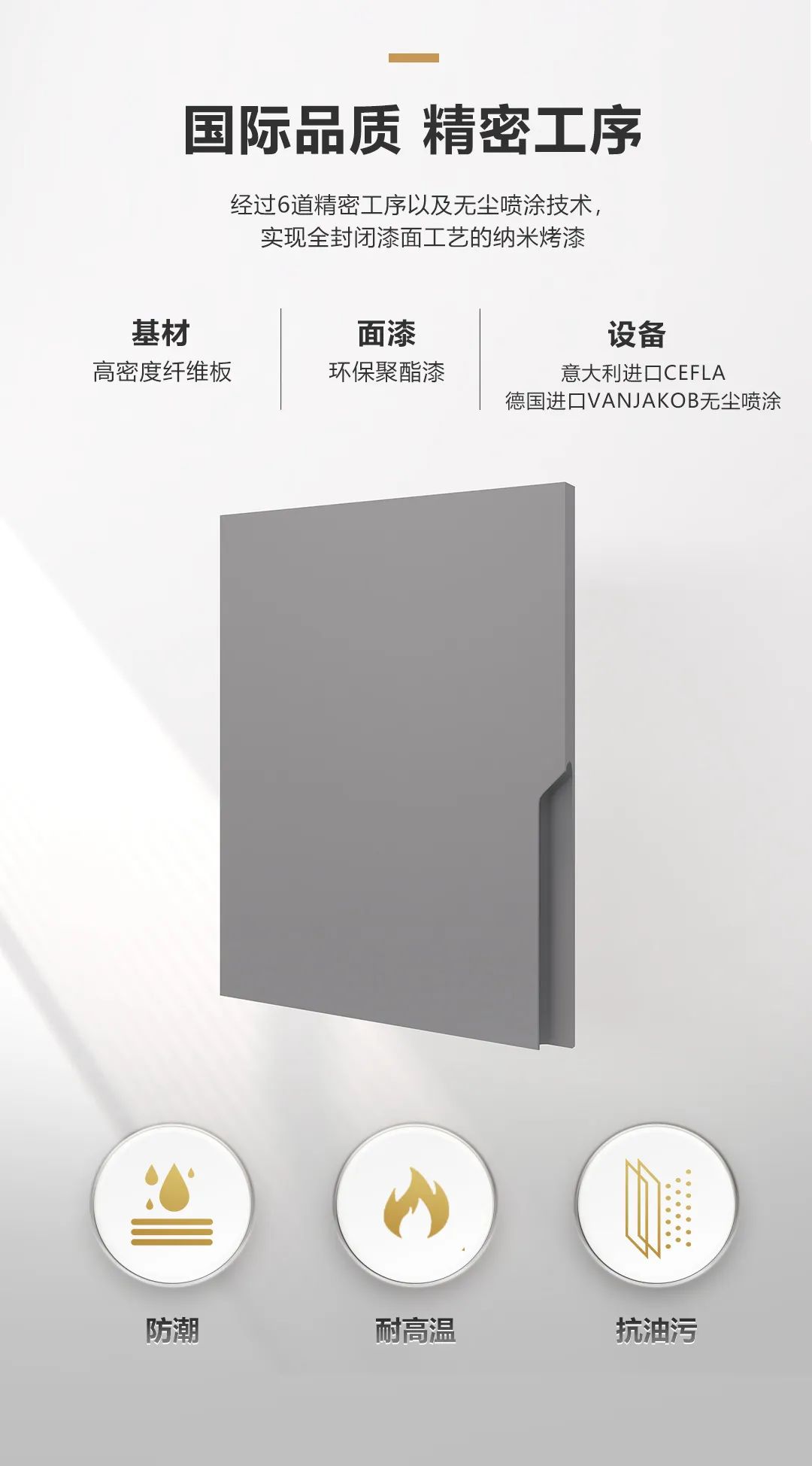 纳米烤漆板表面采用了烤漆工艺,不仅能够有效防水、防潮,无需封边,而且可以满足多种复杂门板造型需求,提升整体空间质感。